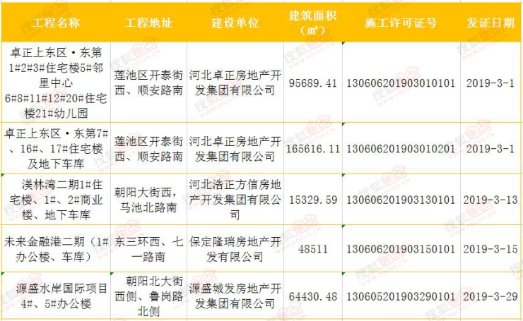 搜狐焦点网自保定住房和城乡建设局获悉,截止到3月31日,3月份保定主城区房地产市场共下发5个施工许可证,施工总面积389576.59㎡,卓正上东区·东第、渼林湾二期、未来金融港二期以及源盛水岸国际获发证件。【详细信息如下图】