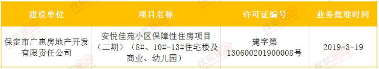 搜狐焦点网自保定市城乡规划管理局获悉,截止到3月31日,保定主城区共下发1个建设工程规划许可证,安悦佳苑小区保障性住房项目(二期)(8#、10#-13#住宅楼及商业、幼儿园)获证。