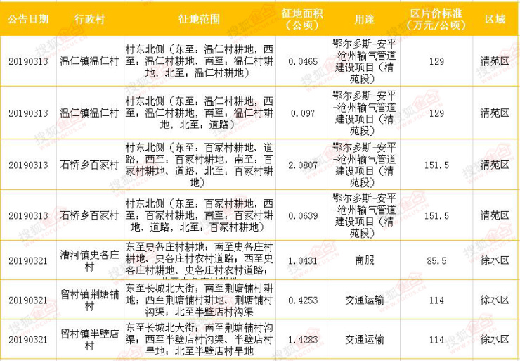 3月,保定五区仅清苑区与徐水区发布征地公告,两区共征地5.1848公顷,约合77.77亩。