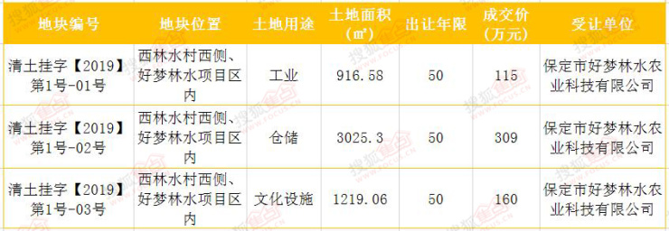 截止到3月31日,3月份清苑区共成功出让3宗地块,包含1宗工业用地,1宗仓储用地,1宗文化设施用地,均位于好梦林水项目区内,由保定市好梦林水农业科技有限公司竞得,出让总面积为5160.94平方米,约合7.74亩,成交价共584万元。【出让地块详情 见下图】
