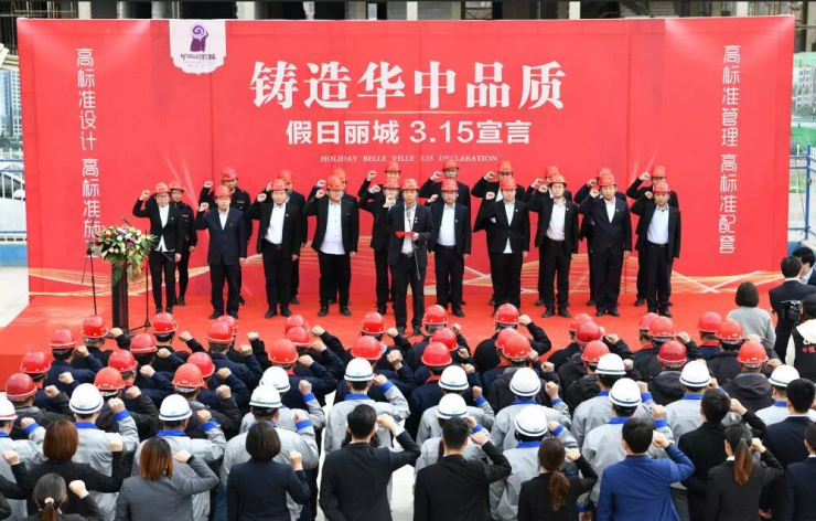 在“315国际消费者权益日”这个特别的日子里,华中集团隆重召开“以工匠精神铸造华中品质•华中集团假日丽城项目部3.15誓师大会”。